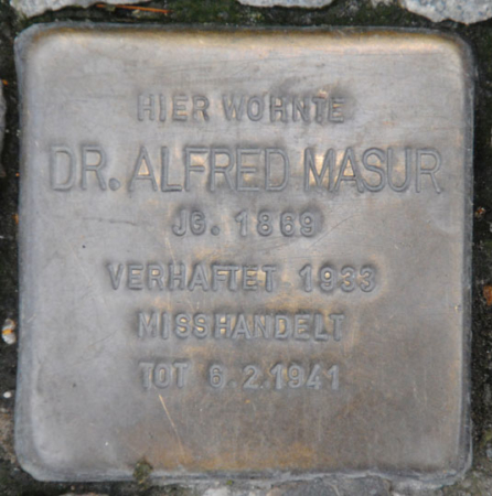 Hier wohnte Dr. Alfred Masur. Geboren am 5. März 1869 in Coburg. Dr. Masur hatte in der Mohrenstraße 26 eine Arztpraxis und war Vorsitzender der Jüdischen Gemeinde.