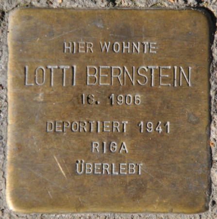 Hier wohnte Lotti Bernstein, geboren am 10. September 1906 in Coburg. Zusammen mit dem Rest ihrer Familie wurde auch Lotti Bernstein am 27. November 1941 nach Riga ins Ghetto gebracht.