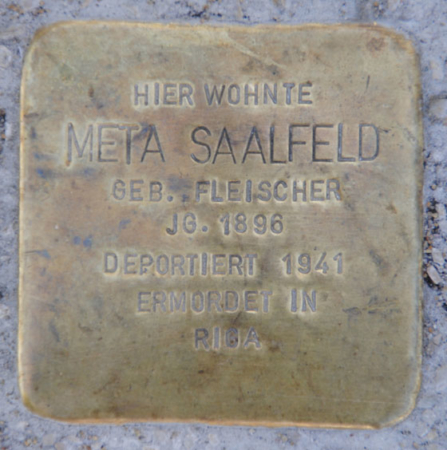 Meta Saalfeld wurde am 28. Oktober 1896 geboren, ihr Mann Martin am 8. Juli 1877. Martin Saalfeld war Mitinhaber der Coburger Holz- und Rohrmöbelfabrik „Bernstein & Saalfeld“ in der Uferstraße 9.